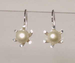 Wunderschöne Ohrringe. Die Süßwasserperlen sitzen in der Mitte einer wie ein Blütenkrönchen aussehender Schale aus Silber.