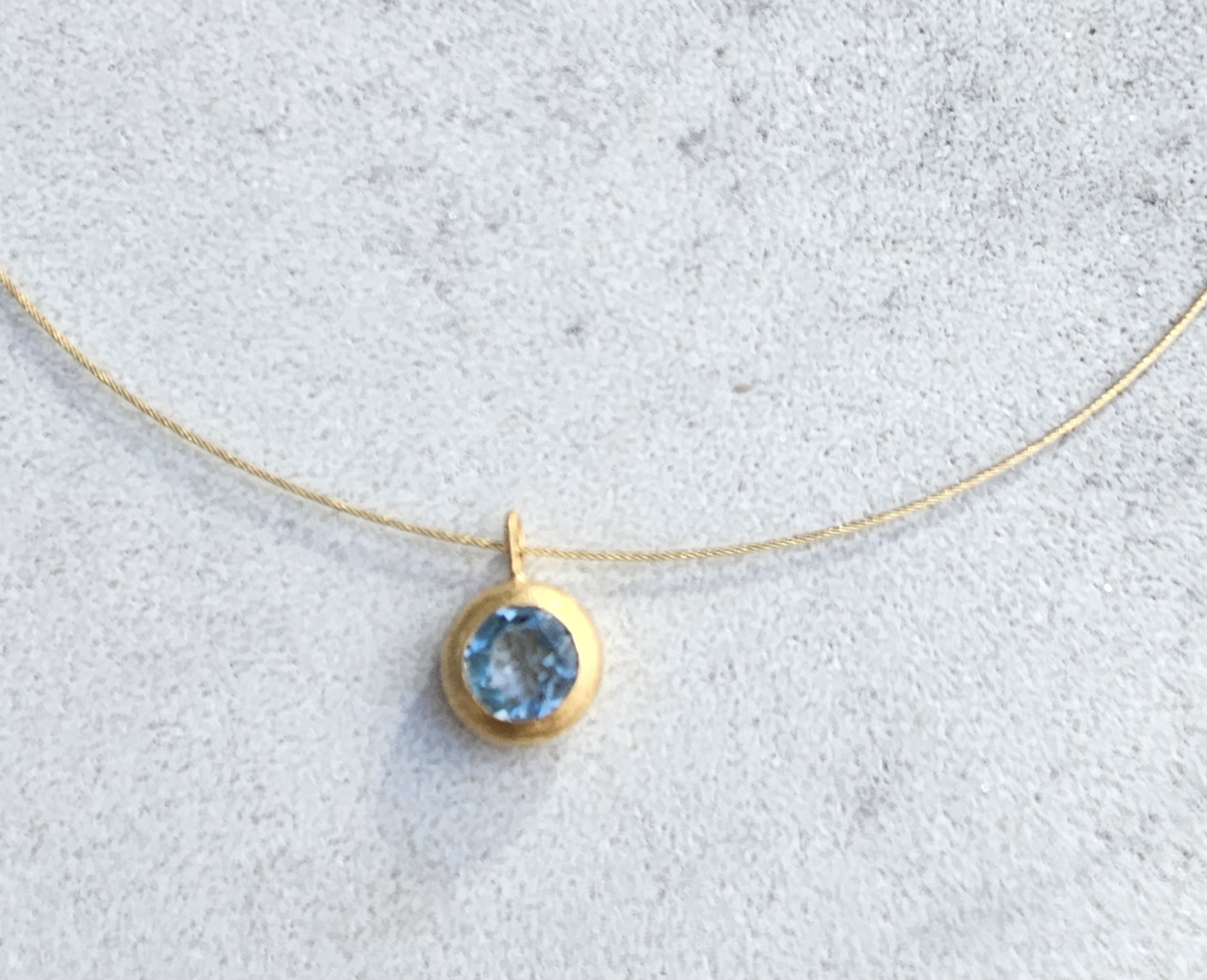 Kleiner Anhänger aus 935/- Silber, goldplattiert mit 750/- Gelbgold und mit einem strahlend, blauen Topas. Der Topas hat einen Durchmesser von 8 mm, der Anhänger insgesamt con ca. 11 mm. Der Anhänger sieht elegant an einem Reif aus, oder an einer langen Kette sehr schick.